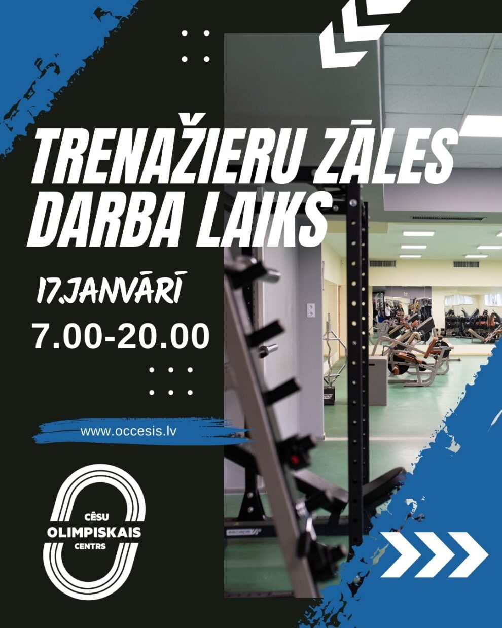 📢 Informējam, ka 17. janvārī trenažieru zāles darba laiks būs no plkst. 7.00 līdz 20.00.