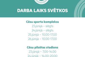 Sākot ar 1.jūliju, Cēsu sporta komplekss pāriet uz vasaras darba laiku. Turpmākās nedēļas sporta komplekss būs slēgts svētdienās. Atvainojamies par sagādātajām...